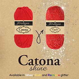 Met Scheepjes Catona Shine voeg je moeiteloos een sprankje glamour toe aan je haak- of breiwerk. Dit katoengaren combineert het vertrouwde gevoel van Catona met een verfijnde glitterdraad in zilver, goud of regenboog. Het resultaat? Een schitterend Scheepjes garen dat soepel verwerkt, niet splijt én precies dezelfde stekenverhouding heeft als de originele Catona. Perfect dus om in één project beide garens te combineren.